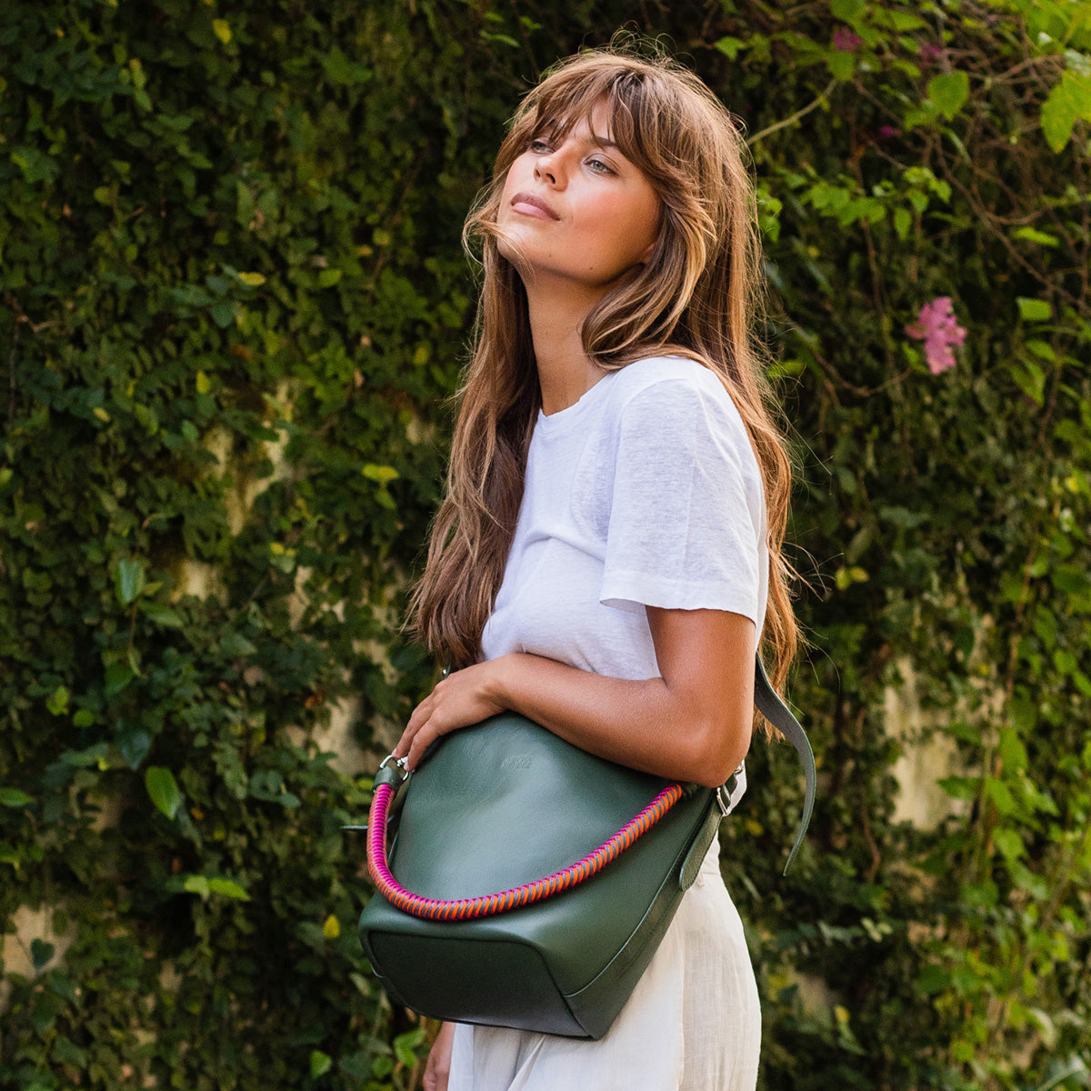 Bolso tipo crossbody de cuero vacuno curtido vegetal y teñido con anilinas.