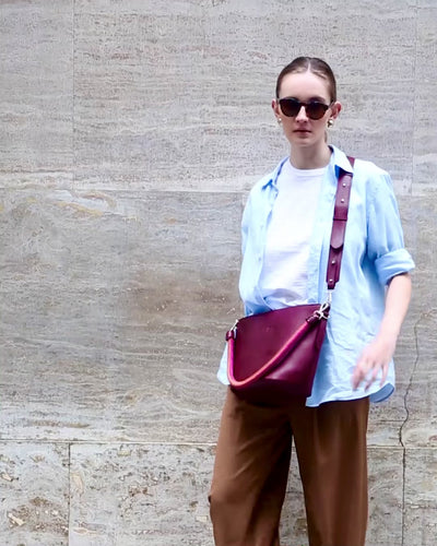 Correa larga desmontable de cuero para llevarlo tipo crossbody.
