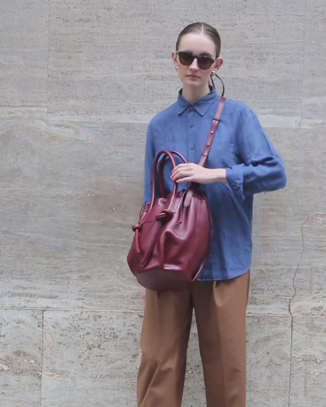 Bolso tipo crossbody de cuero vacuno curtido vegetal y teñido con anilinas.